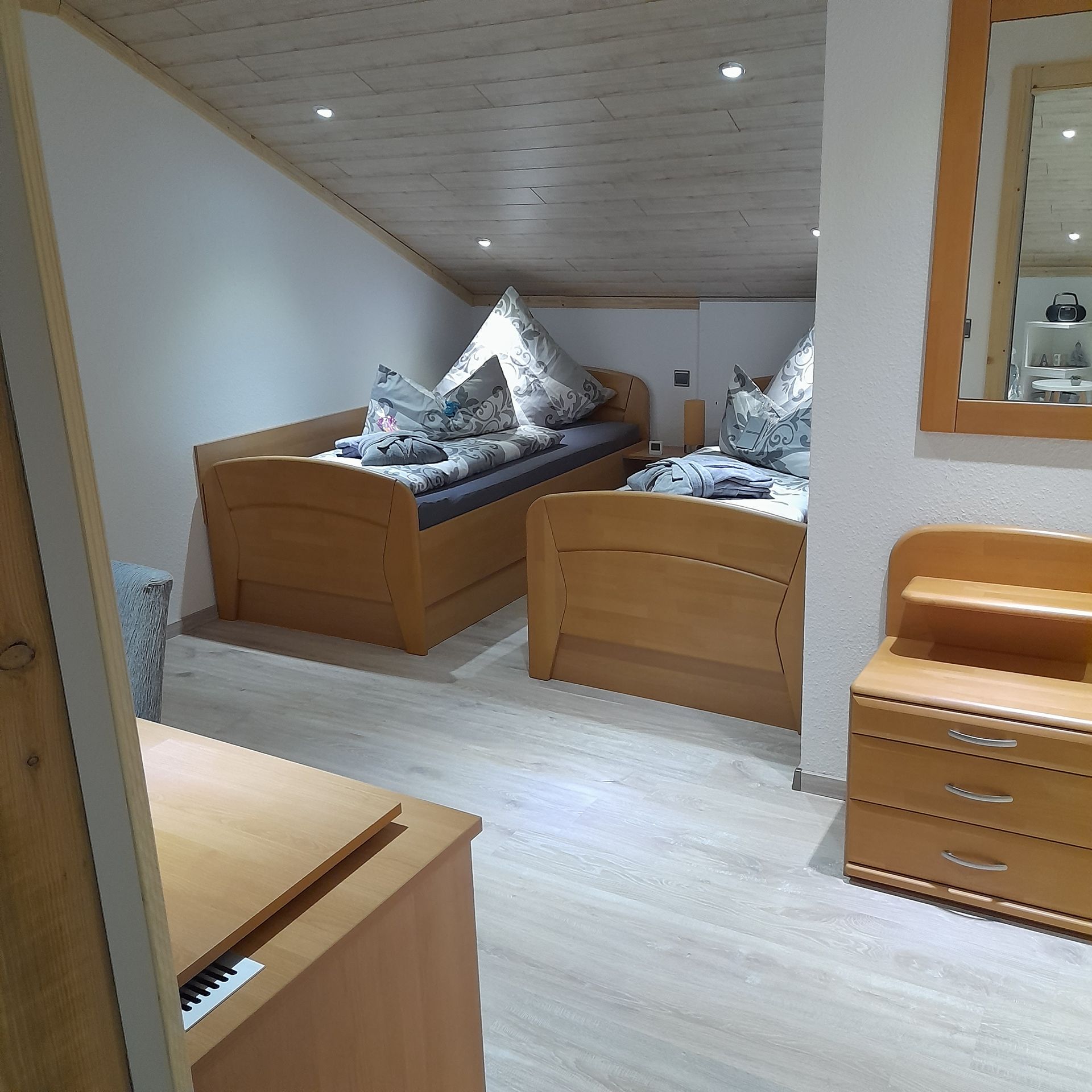 Die Ferienwohnung Waldblick liegt im Obergeschoss und hat eine Größe von ca. 65 m². Von der Wohnküche aus gelangen sie auf den Balkon zum Berg der zum verweilen einlädt und wo sie den ganzen tag die Sonne geniesen können. Die Küche ist mit Geschirrspüler, Ceranfeld und alles was man so braucht ausgestattet. Das Schlafzimmer ist mit Einzelbetten und zusätzlichem TV ausgestattet. Vom Schlafzimmer aus können sie auf den 2 Balkon der zum Wald ausgerichtet ist wo Sie die Morgensonne morgens empfängt und auch Rehe und Hirsche beobachtet werden können. Das Schlafzimmer verfügt über eine separate Toilette. Der Relaxraum verfügt über eine große begehbare Dusche und ein weiteres zusätzliches WC.
